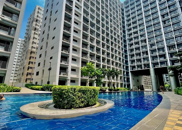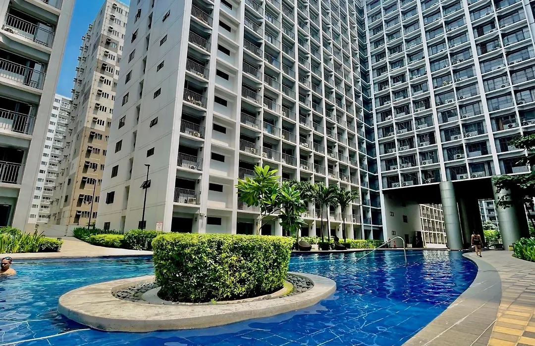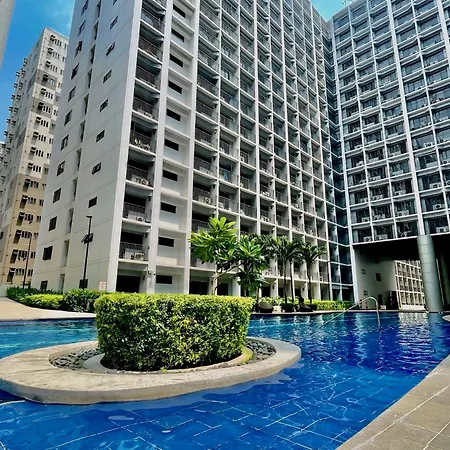ベッドルーム1室のStaycation Near Mall Of Asia, Condotel With King Bed マニラ市アパートに宿泊すると、日本大使館から歩いて20分くらいのテラスでリラックスできます。 涼しいプールでくつろぐこともできます。